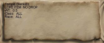 Chesgard Sydwen says 'Good show!! Here you are, young knight. Take these blankets to any resident who desires warmth. Ask them if they are followers of Karana, then ask if they require temple blankets. Be careful, the plains are quite dangerous for a young knight.