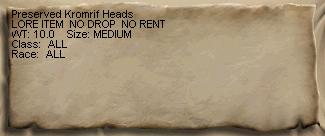 Loremaster Borannin says 'Every year the Dain replaces the trophies in his trophy room. There is a reward given for the best new trophy obtained. I intend to win this year and I will upgrade your prayer shawl for assisting me. Fill this box with ten Kromrif heads and bring me the combined contents along with the burlap shawl. I will submit the best one for the Dain's consideration.